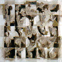 Es muss nicht immer der Pinsel sein. In den Sgrafitti wird aus weichen Farbschichten Figürliches herausgekratzt. Auch hier entsteht ein Dialog getragen von der Interdependenz Material, Werkzeug und Verfahren. Die Farbschichten bestehen aus Emulsionen von Zelluloseleim, Bienenwachs und Leinöl. Wenn man in dieser Weise arbeitet ist es selbstverständlich, dass man sein Material selbst fertigt. Mein Atelier gleicht einem alchemistischen Labor, hier wird gemischt, gerührt, gemixt, gerieben, getestet." (Zitat Ende)