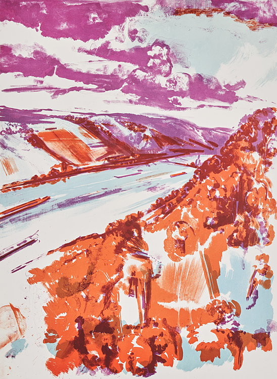 Yvette Kießling: "Blick auf Kaub", 2020, dreifarbige Tuschelithographie, 95 x 70 cm