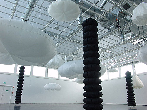 Für das Künstlerpaar Bettina Bürkle und Klaus Illi war es geradezu zwingend, die gewaltige Raumhöhe der Ausstellungshalle des Kunstvereins zum Ausgangspunkt ihrer raumgreifenden Installation zu machen. Der Blick des Betrachters wird beim Betreten der Ausstellung sofort nach oben, zur Decke gelenkt und macht ihm das ganz Spezifische des Raumes bewusst: das riesige, über zehn Meter hohe Tonnengewölbe des Daches ist von einem großen Oberlichtfenster durchbrochen, über dessen beeindruckende Öffnung die Ausstellungshalle mit Tageslicht durchflutet wird. Diesen, für den Betrachter nicht erreichbare Deckenraum, haben die beiden Künstler mit einer weißen Wolkenschicht angefüllt. In wechselndem Rhythmus schwellen die weißen, pneumatischen Skulpturen langsam an, dehnen sich aus und nehmen in einem voll entfalteten Zustand mitunter einen Durchmesser von über 5,50 Metern an. Einige berühren im entleerten Zustand fast den Boden, andere hängen gerade über den Köpfen der Besucher, wieder andere sind weiter oben, direkt unterhalb der Gitterstruktur der Zwischendecke angebracht. Der Himmel, das Wolkenbild ist spielerisch leicht, dann wieder auch dramatisch und verändert sich permanent.